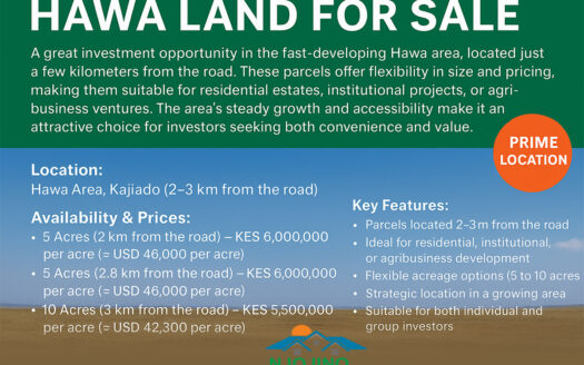 Prime 5–10-acre parcels for sale in Hawa, Kajiado. Located 2–3 km from the road, perfect for residential, institutional, or agr ...
