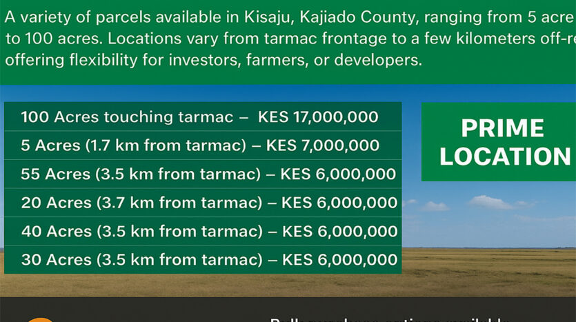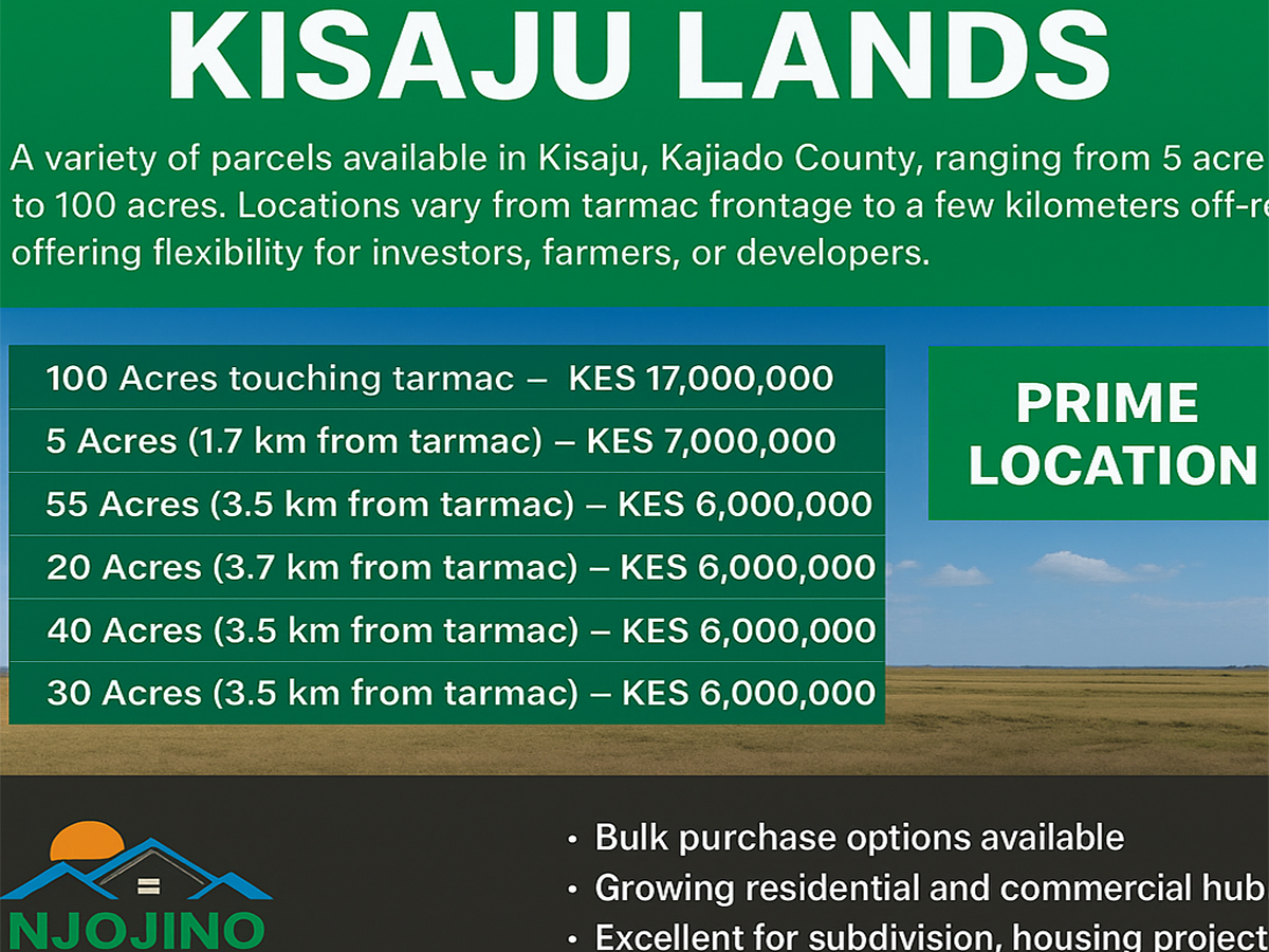 A rare opportunity to acquire prime land parcels in Kisaju, Kajiado County, ranging from 5 acres to 100 acres. These parcels offer strategic locations—some directly fronting the tarmac and others just a few kilometers off-road—making them ideal for residential estates, commercial developments, or large-scale agribusiness projects. With flexible sizes and bulk purchase options, Kisaju presents a high-growth investment destination in a rapidly developing corridor.