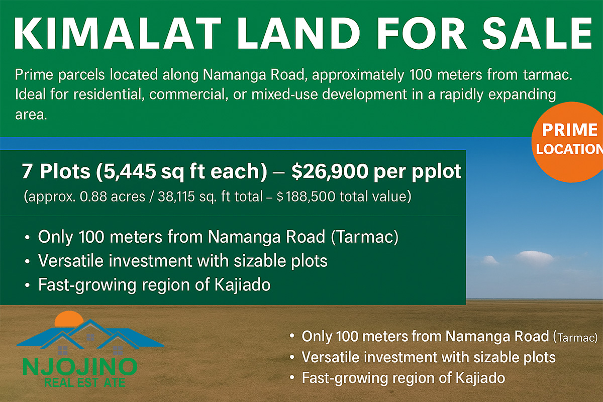 Exceptional investment opportunity along the busy Namanga Road corridor. These Kimalat plots, located just 100 meters from the tarmac, offer a perfect blend of accessibility and value. Ideal for residential, commercial, or mixed-use development, the area is rapidly expanding and attracting both private and institutional investors.